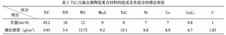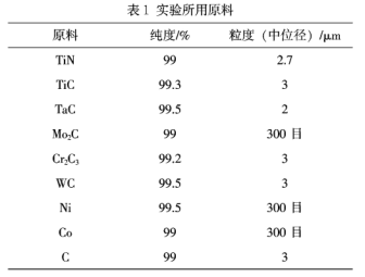 金屬陶瓷(cermet)是由一種或幾種金屬組分與陶瓷材料經(jīng)過復(fù)合而成的一種非均質(zhì)材料,其中,陶瓷組分約占15~85 vol%。Ti(C,N)基金屬陶瓷復(fù)合材料出現(xiàn)于20世紀(jì)70年代,由于其具有硬度高,較理想的高溫性能和耐磨性,較好的化學(xué)穩(wěn)定性,以及較高的抗月牙洼磨損能力與抗氧化能力等性能優(yōu)點(diǎn),因而廣泛應(yīng)用于切削刀具、耐磨材料等領(lǐng)域。地殼中Ti資源含量豐富,成為可代替稀缺資源WC基硬質(zhì)合金材料的候選材料之一,因此近年來Ti(C,N)基金屬陶瓷復(fù)合材料成為熱門研究方向。Ti(C,N)基金屬陶瓷材料以Ti(C,N)為基礎(chǔ)硬質(zhì)相(添加方式主要是直接添加Ti(C,N)或者添加TiC與TiN再合成Ti(C,N),后者具有經(jīng)濟(jì)優(yōu)勢(shì)),采用Ni、Co或(和)Mo等金屬或合金為粘結(jié)相,根據(jù)工況添加其他一些難熔的氮化物或碳化物(如SiN?、AIN、WC、MoC、VC等)為增強(qiáng)相而制成的一種復(fù)合材料。本實(shí)驗(yàn)以TC和TiN為基礎(chǔ)原料合成Ti(C,N),添加碳化物WC、MoC、CrCa、TaC作為補(bǔ)強(qiáng)相,以Ni和Co為復(fù)合金屬粘結(jié)相,通過熱壓燒結(jié)工藝制備了Ti(C,N)基金屬陶瓷復(fù)合材料。