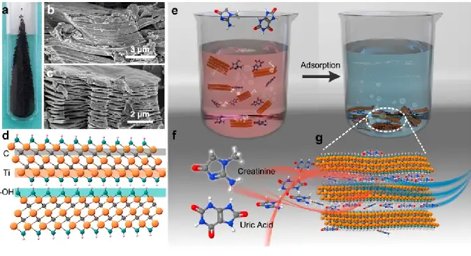 美國德雷塞爾大學(xué)Yury Gogotsi教授團(tuán)隊(duì)[6]將Ti3C2Tx,一種已知能有效吸附尿素的MXenes材料,用于從水溶液和透析液中去除肌酐和尿酸,最大吸附量分別為45.7和17.0 mg g-1。作者系統(tǒng)地分析和模擬了吸附動力學(xué)、等溫線和熱力學(xué),從而確定了限速步驟和吸附機(jī)理,并設(shè)計了一個裝有Ti3C2Tx的固定床柱,以進(jìn)一步評估連續(xù)流體流動條件下的吸附性能,反映連續(xù)腎臟替代治療方法的條件。該研究表明,Ti3C2Tx具有作為透析液再生的有效吸附劑的潛力,通過去除過濾的毒素加速透析液再生,實(shí)現(xiàn)更便攜的透析設(shè)備制造,體現(xiàn)出MXenes材料在醫(yī)藥領(lǐng)域的應(yīng)用潛力(圖8)。