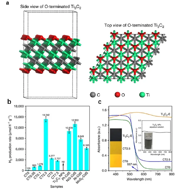 如上圖6所示,喬世璋課題組[4]通過DFT理論計算指導(dǎo)合成了一種具有高效共催化性能的MXene材料:Ti3C2納米顆粒。研究人員通過水熱法將Ti3C2納米顆粒集成到吸光材料CdS表面,實(shí)現(xiàn)了活性高達(dá)14342 μmol h-1 g-1的可見光催化產(chǎn)氫,且在420 nm處表觀量子效率為40.1%(圖6 b)。該研究成果首次將MXene作為共催化劑引入到光解水產(chǎn)氫體系中,證明了MXene在取代Pt,構(gòu)建低成本、高性能光電極或者光催化劑方面展現(xiàn)出來的巨大潛力。