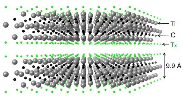 因此,在氫氟酸溶液中,MAX相的A原子層易于被刻蝕,剩下M與X原子層形成二維Mn+1Xn原子晶體,為了強(qiáng)調(diào)它們是由MAX相剝離而來,并具有與石墨烯(Graphene)類似的二維結(jié)構(gòu),將它們統(tǒng)一命名為MXene。根據(jù)各種過渡金屬(如Ti,Mo,V,Cr及其與C和N合金)的組合,材料科學(xué)家已經(jīng)確定或預(yù)測了成百上千種不同MXenes的穩(wěn)定相。