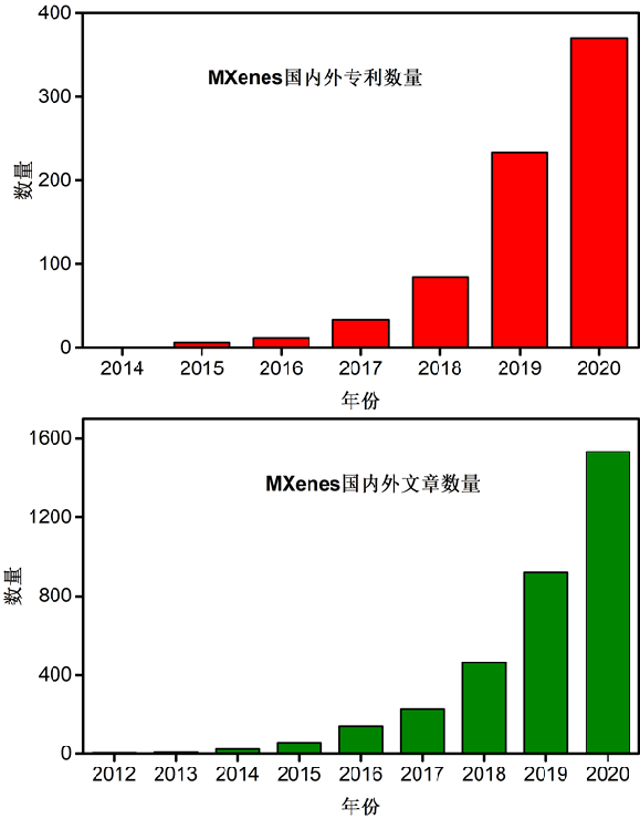 圖2 從“Web of Science”網(wǎng)站統(tǒng)計與MXenes相關(guān)的文章及國內(nèi)外專利數(shù)量