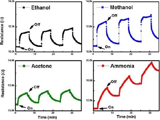 奧本大學(xué)Dong-Joo Kim教授[7]第一次報道了基于Ti3C2Tx的氣體傳感器,并籍此測試了乙醇、甲醇、丙酮和氨氣。作者將合成的Ti3C2Tx納米薄片用易操作的溶液澆鑄法制備在柔性聚酰亞胺薄膜上,并對其表面化學(xué)性質(zhì)進(jìn)行了研究。如圖9所示,Ti3C2Tx傳感器在室溫下成功地檢測了乙醇、甲醇、丙酮、氨氣等氣體,表現(xiàn)出p型傳感行為。由于Ti3C2Tx傳感器具有較大的吸收能量,因此對氨氣有較高的傳感響應(yīng)。根據(jù)傳感材料與傳感材料之間的相互作用產(chǎn)生的多數(shù)電荷載流子轉(zhuǎn)移,提出了該傳感器可能的傳感機(jī)理。這種新型的Ti3C2Tx氣體傳感器將是未來可穿戴電子設(shè)備的新一代通用傳感器,其性能可與其他2D材料傳感器相媲美,這也為MXenes材料在傳感器方面的應(yīng)用提供了一個新的方向。