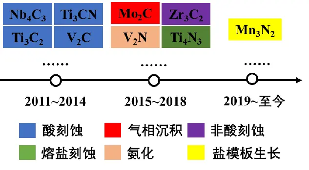 隨著MXenes家族的壯大,對MXenes材料的研究也日益增多。圖3羅列了發(fā)現(xiàn)MXenes材料的進(jìn)展的簡要時間表??梢钥吹浇鼛啄闙Xenes材料的發(fā)展速度越來越迅速,并且可以從圖中看到制備MXenes材料的工藝流程也越來越豐富,逐漸從使用高毒性和高腐蝕性的HF溶液發(fā)展到通過熔融鹽、高溫堿溶液和電化學(xué)方法剝離等更豐富更綠色健康的方法和工藝[2]。