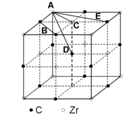 下圖是ZrC的晶體結(jié)構(gòu)(面心立方晶體結(jié)構(gòu)),Zr原子組成立方晶格,C原子位于晶格的八面體間隙位置。在碳-鋯化學(xué)反應(yīng)系統(tǒng)中存在很寬范圍的非化學(xué)計量現(xiàn)象,即ZrCx(0.5≤x≤1)。因此碳化鋯(ZrC)是一種非化學(xué)計量間隙化合物,ZrC陶瓷材料中普遍存在著碳空位。