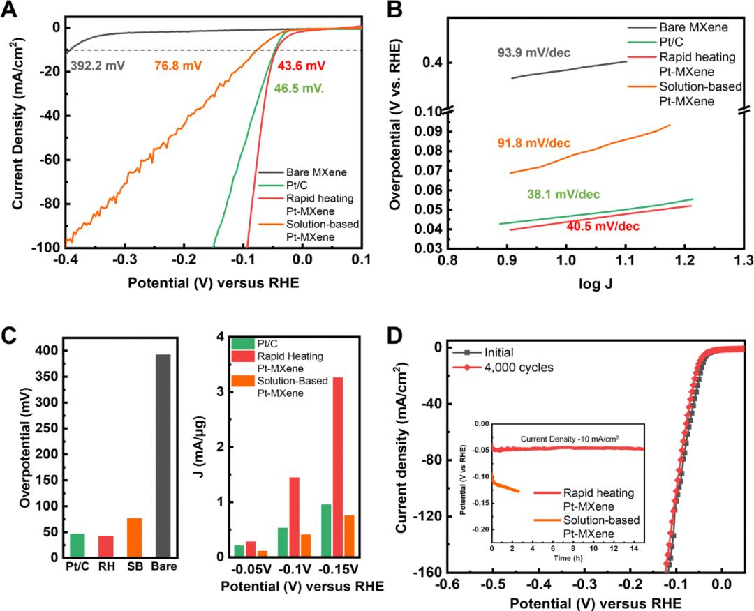 圖3 展示了快速加熱Pt-MXene作為電催化劑在HER中的性能。快速加熱Pt-MXene表現(xiàn)出低過電位和高催化活性,與商業(yè)Pt/C相比具有更高的質(zhì)量活性和更低的Tafel斜率。這歸因于Pt納米顆粒的均勻分布和MXene表面在合成過程中的保護,從而最大化了催化活性位點的暴露。此外,快速加熱Pt-MXene在長期穩(wěn)定性測試中顯示出優(yōu)異的穩(wěn)定性,遠超過溶液處理的Pt-MXene。