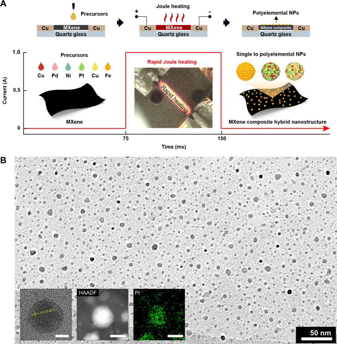 針對上述問題,韓國科學技術院(KAIST)Hee-Tae Jung等提出了一種無需溶液的MXene基復合雜化納米結(jié)構(gòu)合成方法,利用快速焦耳加熱技術克服了傳統(tǒng)溶液法在合成過程中MXene氧化的缺點。通過向MXene基材上加載前驅(qū)體并施加快速熱沖擊,成功合成了包含Pt、Co、Cu、Ni、Fe、Pd及其合金等多種成分的MXene復合雜化納米結(jié)構(gòu)。實驗結(jié)果顯示,快速焦耳加熱技術具有多方面優(yōu)勢,包括最小化MXene氧化、雜化成分分布均勻無嚴重團聚、以及多元合金合成均勻性。研究通過合成的Pt-MXene納米復合材料展示了該方法的有效性,該復合材料在氫析出反應(HER)中表現(xiàn)出優(yōu)異的電催化活性和穩(wěn)定性。這一技術不僅保留了MXene的獨特性質(zhì),還適用于多種應用場景,特別是在MXene復合材料的協(xié)同效應能夠帶來性能顯著提升的領域。