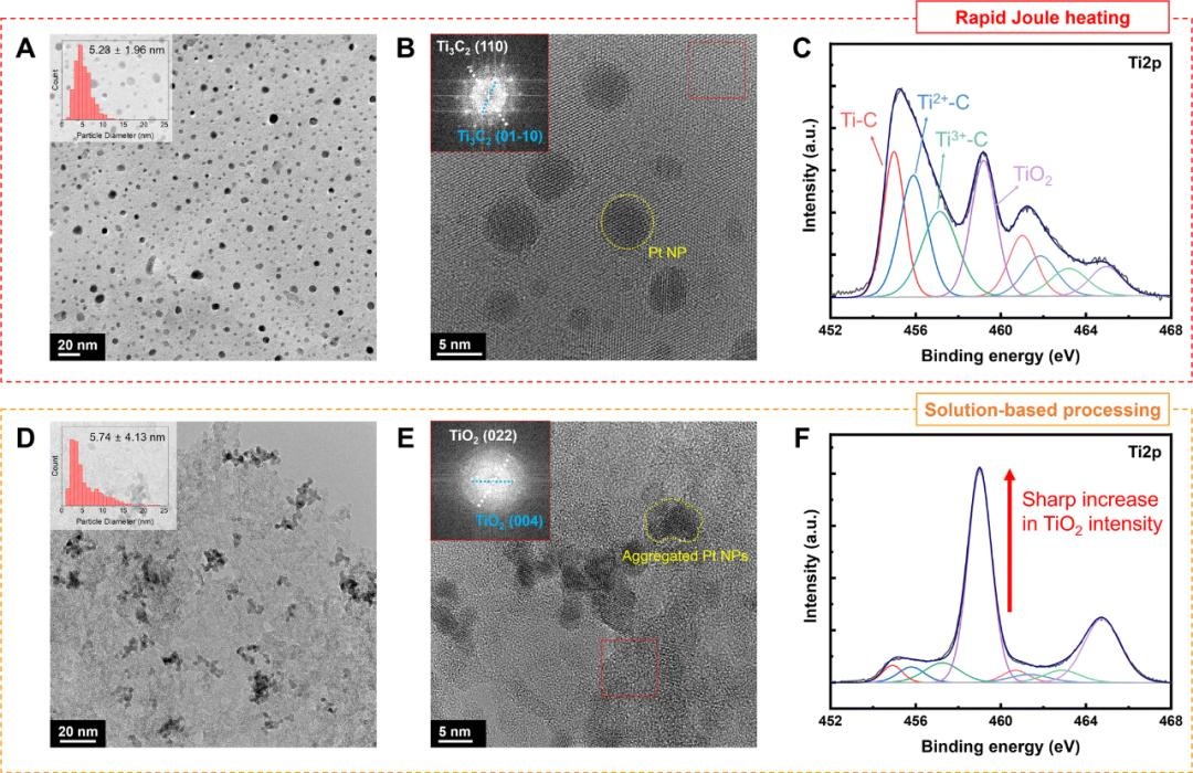 圖2 比較了快速加熱和傳統(tǒng)溶液處理方法制備的Pt-Ti3C2Tx MXene復合納米結(jié)構(gòu)的表面結(jié)構(gòu)和形貌??焖偌訜岱ㄖ苽涞腜t納米顆粒表現(xiàn)出高度均勻分散,而溶液處理法則導致Pt納米顆粒在MXene表面嚴重聚集。此外,快速加熱法顯著減少了MXene的氧化,而溶液處理法則導致MXene氧化成TiO2。XPS和XRD分析進一步證實了快速加熱法在合成過程中對MXene的保護作用,減少了氧化。