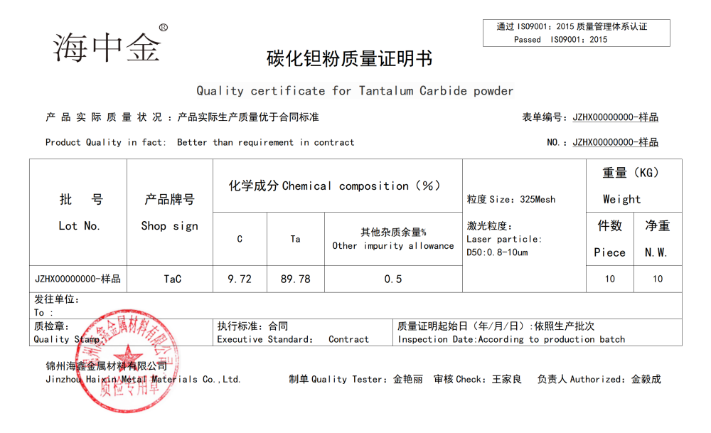 4)TaC還在切削工具、研磨材料、電子材料以及催化劑等領(lǐng)域具有廣泛應(yīng)用前景。例如,將TaC添加在硬質(zhì)合金中可以阻止硬質(zhì)合金的晶粒生長,提高硬質(zhì)合金的硬度,改善其使用壽命;TaC具有良好的導(dǎo)電性,并且可以組成非化學(xué)計量化合物,導(dǎo)電性隨組分不同而產(chǎn)生變化,這種特性使TaC在電子材料領(lǐng)域具有誘人的應(yīng)用前景;在TaC的催化脫氫方面,有研究者對TiC、TaC的催化性能研究表明,在較低溫度下,TaC基本沒有催化活性,但在高于1000℃時,其催化活性明顯升高。對于CO的催化性能方面的研究發(fā)現(xiàn),300℃時TaC的催化產(chǎn)物有甲烷、水以及少量的烯烴。