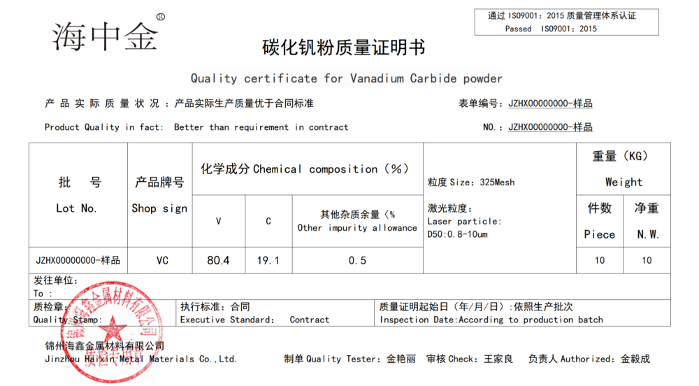 1.高熔點:碳化釩的熔點高達2810°C左右,是目前為止熔點最高的化合物之一,因此碳化釩在高溫環(huán)境下具有很好的穩(wěn)定性。