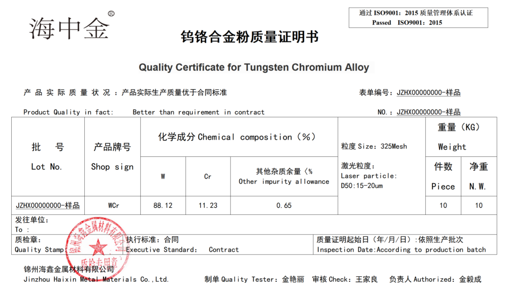 產品名稱:鎢鉻(WCr) 規(guī)格:100目、200目、325目   形貌:不規(guī)則 顏色:銀灰色  特點:具有優(yōu)異的耐熱性能,穩(wěn)定性,耐高溫,耐酸堿,抗熱震。 用途:鎢鉻合金力學性能好,應用最廣,主要制造冷剪金屬的刀片、鏟搓螺紋板的鏟刀、大型重載冷鐓沖頭、中載鋼板穿孔沖頭、風動工具及精壓模冷沖栽和切邊用模具等。