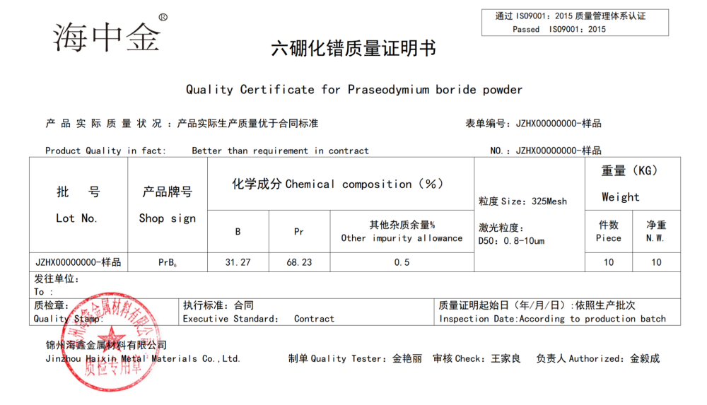 產(chǎn)品名稱:六硼化鐠(PrB6