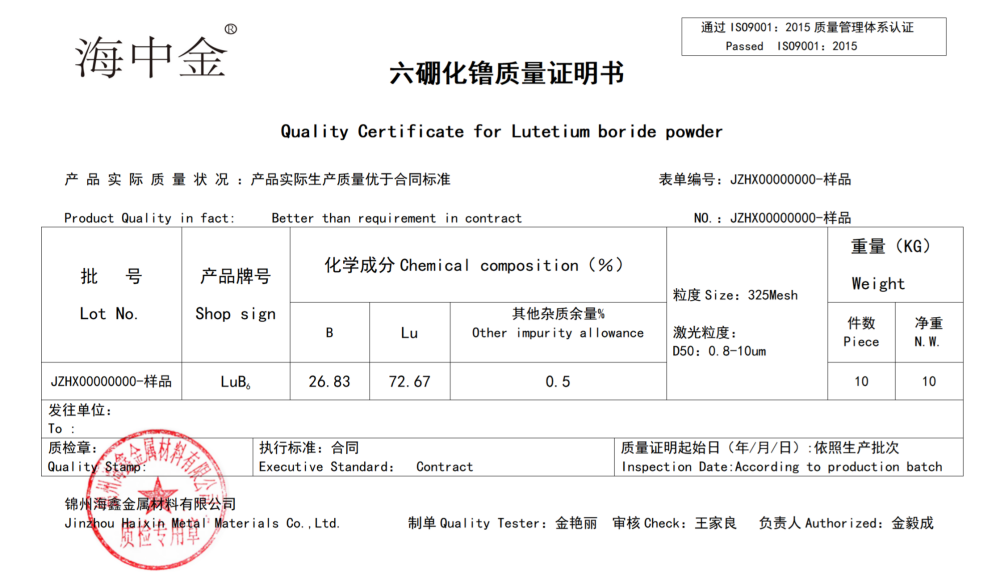 產(chǎn)品名稱(chēng):六硼化镥(LuB6)