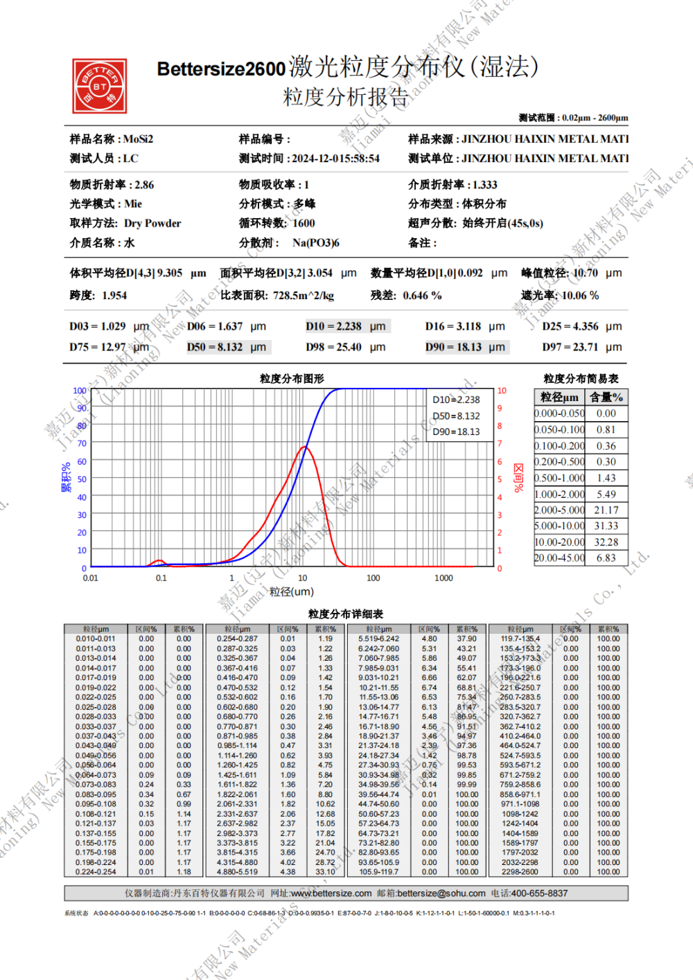 產(chǎn)品名稱:二硅化鉬(MoSi2) 規(guī)格:0.8-10um(D50)   形貌:不規(guī)則 顏色:黑灰色  特點:高熔點(1930-2030℃)、低密度(6.31 g/cm³)、良好的‌導熱性、‌導電性和高溫抗氧化性 用途:高溫抗氧化涂層材料、‌電加熱元件、‌集成電極薄膜、‌結(jié)構(gòu)材料、復合材料的‌增強劑、‌耐磨材料、結(jié)構(gòu)陶瓷的‌連接材料等領(lǐng)域