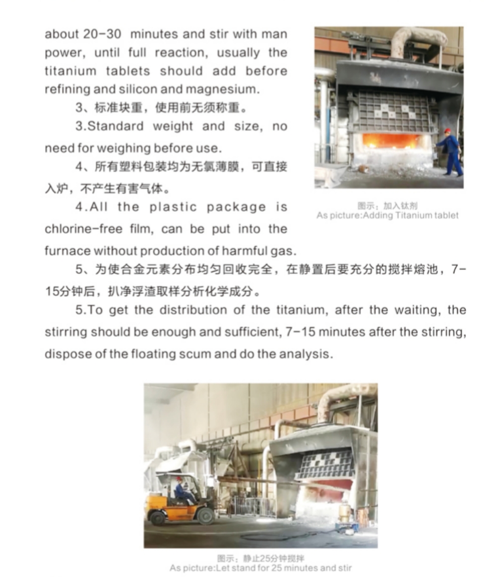 用途:鈦劑是一種常用的鋁合金細化劑,通過添加適量的鈦元素,在鑄造過程中可以使鋁合金中的晶粒變細,從而提高合金的力學性能和耐腐蝕性能